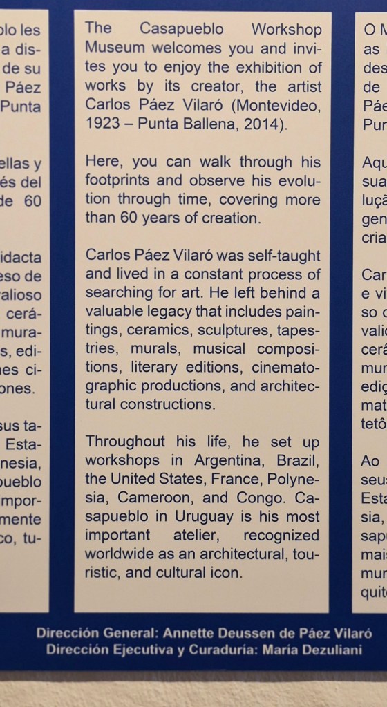 My Uruguay friend, Ale, had given me the names of two places to visit, but he owns a car, and I don’t, which meant I had to take a bus, and walk quite a bit. The first, Casapueblo (House of the People), was a total surprise. It is a huge, architecturally unorthodox house, built over 30 years by a world renowned artist Carlo Páez Viraló. He knew many world leaders, travelled widely, painted with Pablo Picasso and represented the cause of Africans in his artwork. The house started off as a wooden shed that he had built as his studio, which he later personally plastered and added on to, with the help of friends. I watched a video about his life – truly inspirational.
