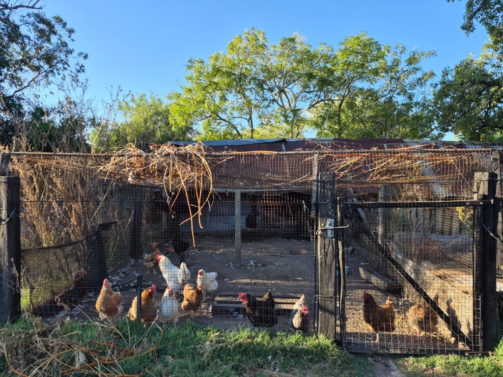 It was also my job to let the chickens out at 18h00, to collect any eggs they might have laid, and fill the water trough. And to be sure that all 14 hens and the cock were safely back in the run before closing it later, as there were small foxes and other predators around that could’ve caught them. The first night Maria and Hugo were not there, and thinking there were 14 chickens in total (I had not understood that there were 14 hens and one cock), I was happy that they were all safe and sound, having counted 14. As I walked back to my room, a hen came sauntering by, totally confusing me. The misunderstanding was cleared up the following day when they explained about the 14 + 1. One hen had a long cloth string attached to her leg, and was being picked on by the other chickens. When I asked Maria about it, she said she had been broody and had been tied up, and if I could catch her, I could untie the string. That evening she had accidentally tied herself up around a pole in the chicken run, so it was easy to just pick her up and remove the string. I am convinced the extra egg the following day was her feeling liberated and able to lay again.