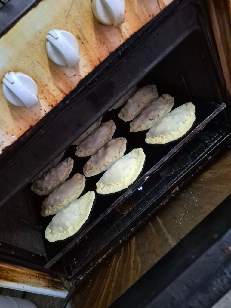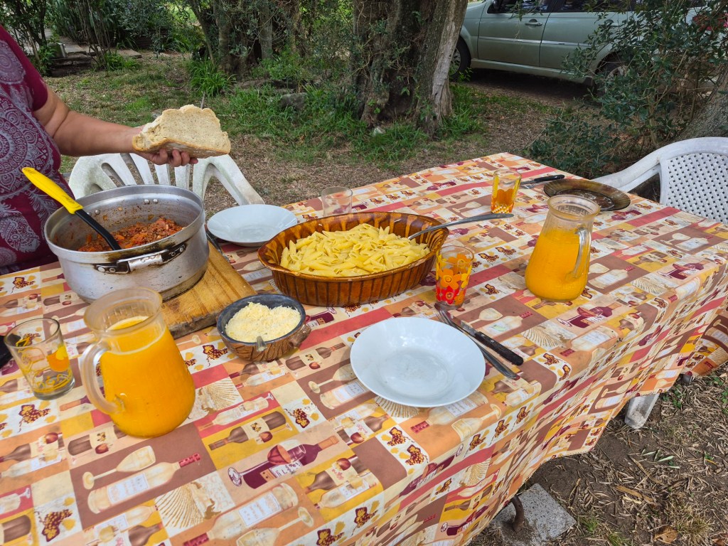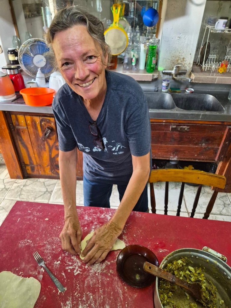 When I’d done all that, I found Sabino in the kitchen making empanadas. and he invited me to try to make one. He was very impressed with my first attempt, and we continued making all of them (which were for lunch and for supper), discussing politics in his broken English and my poor Spanish. Lunch was always at a table under the trees, as the kitchen was too warm. I had to set the table with plates, cutlery, glasses and freshly squeezed orange juice. After lunch I cleared away everything, did the dishes and pots or pans that had been used for cooking, and swept the kitchen floor. Feeling a little bit like cinderella, it occurred to me that that is what it must have felt like for the servants on our farm in South Arica, who were always cleaning up after us. The big difference being that here I was eating with the family, and they never did – a humbling and shaming thought.