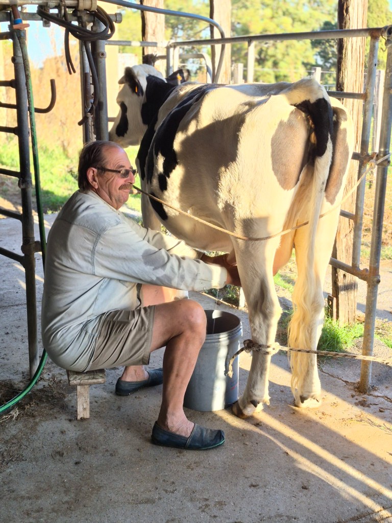 On the second morning I decided to help Hugo fetch the cow and watch him milk. He asked me to try, but no matter how hard I squeezed those teats, I just couldn’t get the milk to come out. It was a strange feeling, I could feel the milk going back up into the udder, instead of out. Hugo was very encouraging, explaining how I had to curl my fingers from the top to the bottom, but to no avail. We had quite a laugh, and eventually I just gave up. After milking, we fetched the calf, which was almost full-grown, to drink. Hugo walked into the camp, calling out as he searched for it, and eventually the calf appeared from the bushes a way off. My mother used to call her tortoises on the farm in the same way.
