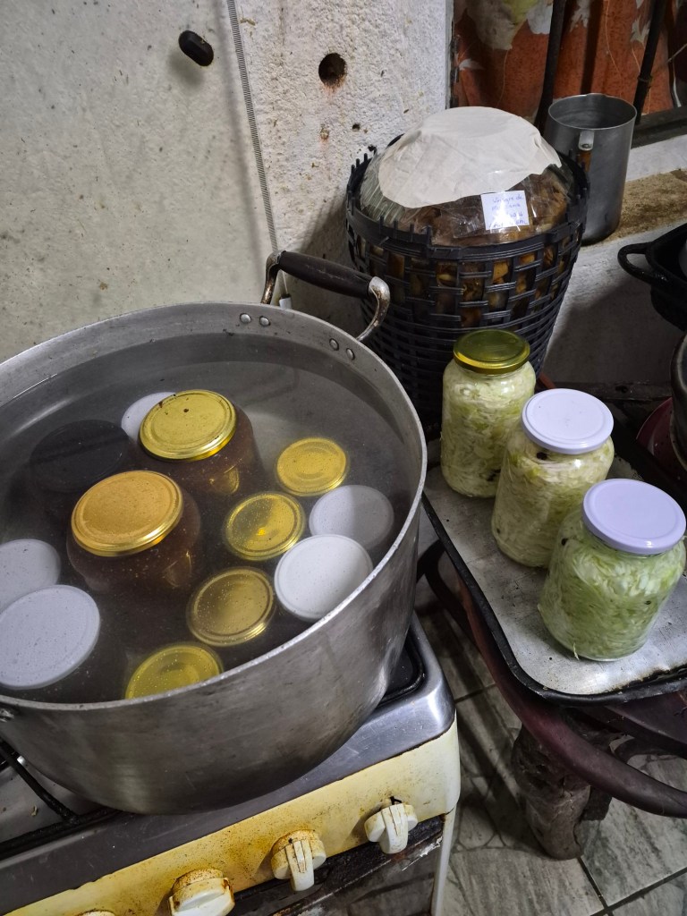 Another whole morning with Maria was spent making apple vinegar and cutting and salting cabbage, which gets bottled and is used as probiotic. Maria also sterilized the jams and salsa she had bottled, which I then had to lable.