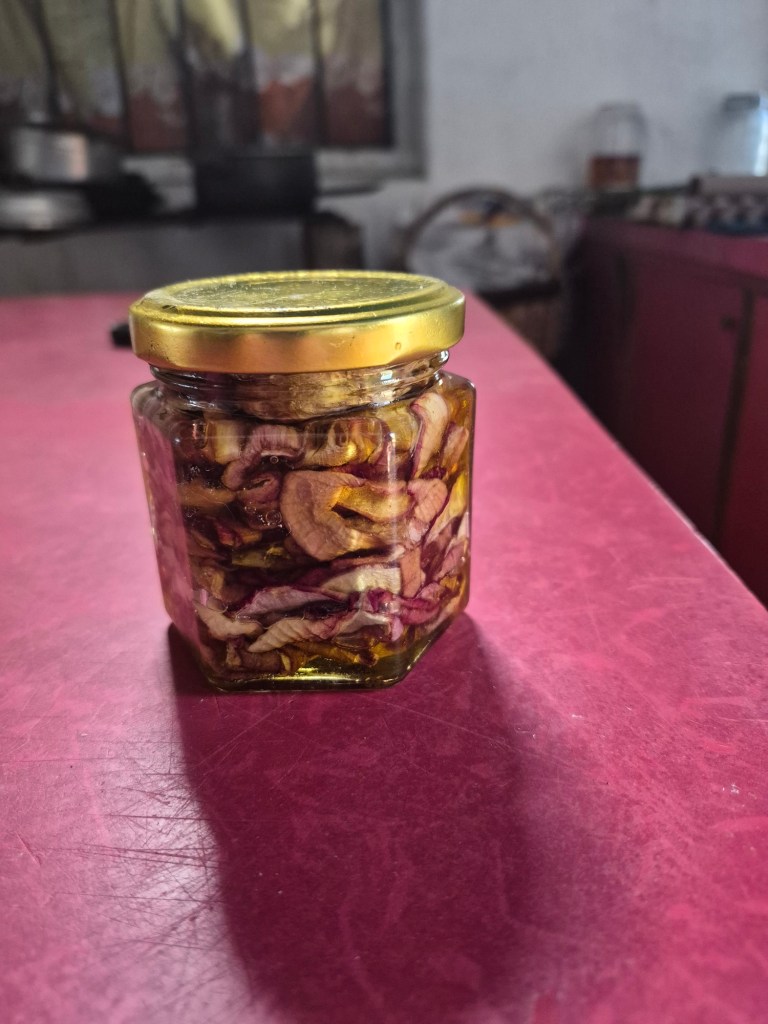 At some stage Sabino walked into the kitchen with a piece of a root of the Ceibo tree, which has medicinal properties. Maria then showed me how she makes smoked olive oil (aceite de carbon) which she served on our pasta that afternoon for lunch. She put a piece of the wood on the gas stove, let it burn until it was red when the flames were blown out, and dunked it in a cup of olive oil, immediately covering it with a saucer. She did it twice to get more of the smoked flavour. She had also come up with a recipe of salted, dried onions which she bottled using the smoked olive oil. Evidently one can buy smoked olive oil, but it is very expensive. It is absolutely delicious!