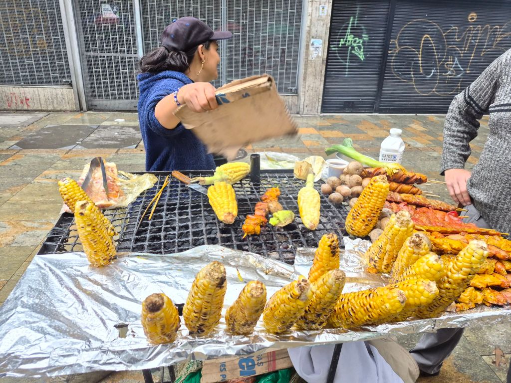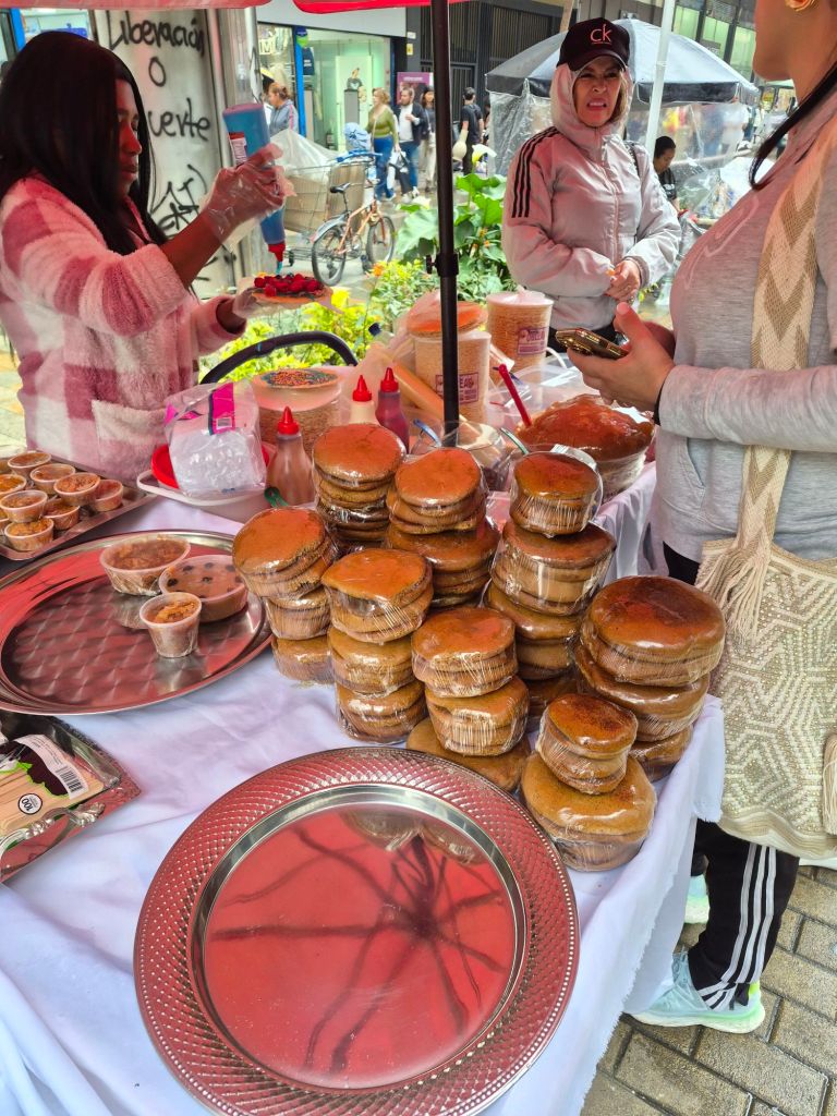 Back in Bogotá I stayed at the Hotel Artistico again, and discovered a small restaurant with good food around the corner, one block away. I was a bit wary of going out after dark, but hunger made me brave and Rickus’ advice was to walk purposefully with chin held high – it worked, no threats at all. The matronly woman who runs the restaurant, does everything – the cooking, serving, cleaning and payments, all very homely. The hamburger had fesh lettuce, tomatoes, cheese and a decent patty. No eating utensils were provided, so the eating was a homely mess too. One of my favourite meals has become the arepas de maiz (round, flat buns that are made from maize flour). They are sliced open, like a pita, and filled with anything. I first had them at Xio’s house, when she made them with a curry mince filling and cheese. The breakfast ones on the market street are filled with egg and cheese, and served in a foil envelope that keeps it warm.