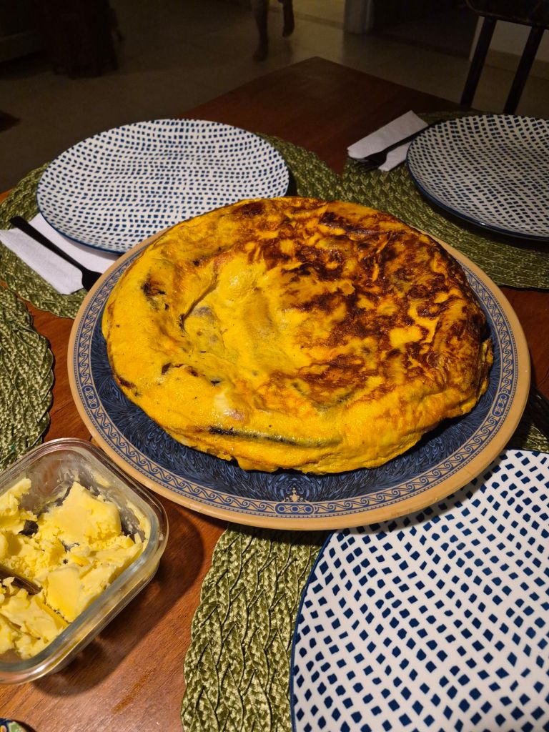 When we came back from Salento, Amanda had made a perfect tortilla with plantains from the garden. Usually the tortillas are made with fried potato pieces, but the plantains give a different flavor and texture. Plantains are a big type of banana that is used only for cooking. The thin flat chips that are made from them are often served as a side dish instead of potato chips.